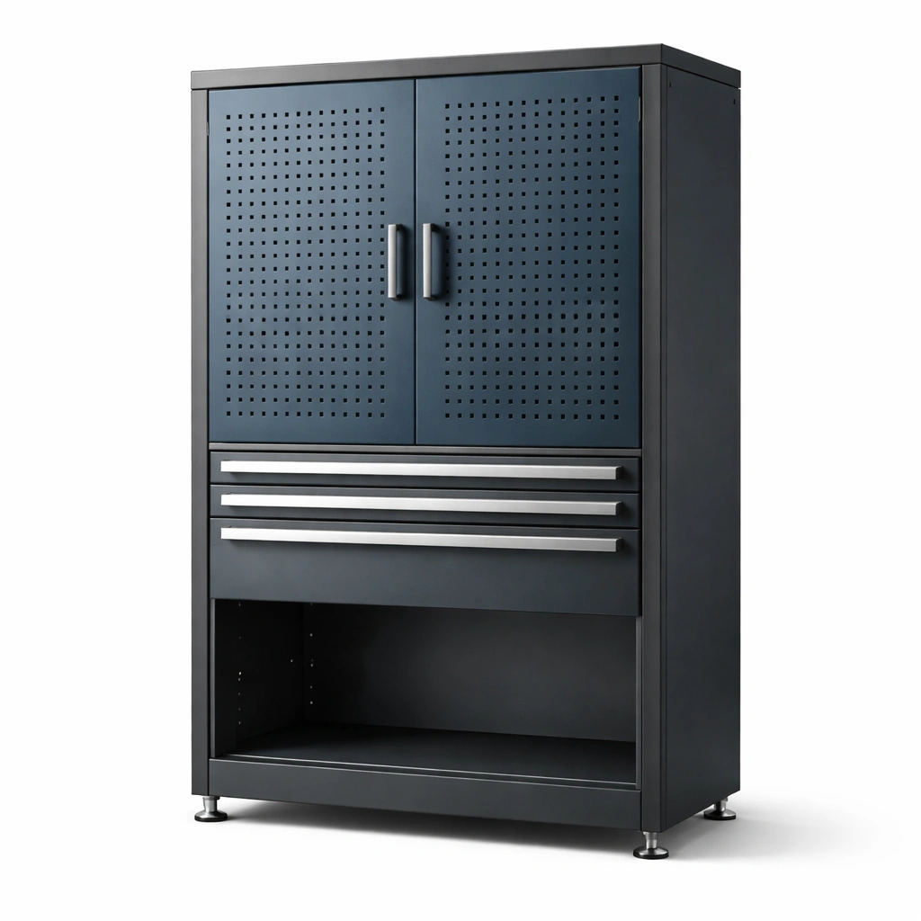 Armario de herramientas metálico con puertas perforadas y cajones de acero negro gris