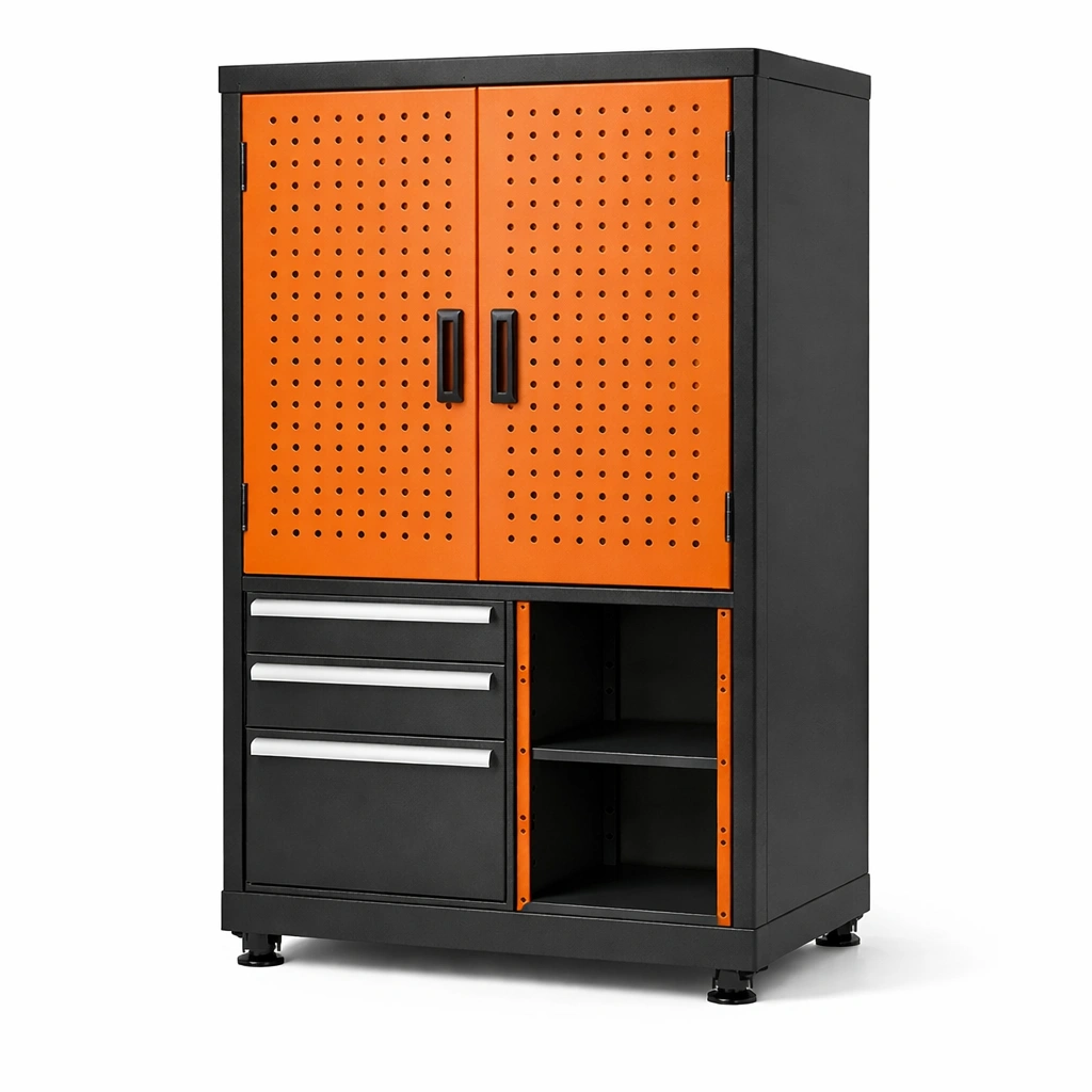 Cuerpo principal de acero pintado con polvo. Dimensiones: 100 cm x 50 cm x 200 cm. Peso: 55 kg. Colores: Naranja y Negro. Incluye puerta doble perforada, tres cajones y dos estantes internos ajustables. Manijas de plástico. Pedestal metálico ajustable. Mecanismo de bloqueo incorporado.