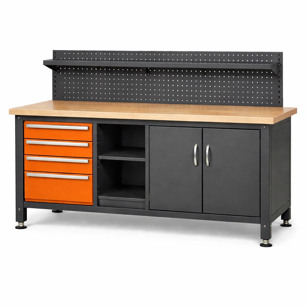 Banco de trabajo con estructura de acero recubierto con pintura en polvo y superficie de madera contrachapada. Incluye tres cajones de metal en color naranja, dos puertas de almacenamiento y dos estantes intermedios. Capacidad de carga máxima de 100 kg. Patas ajustables para estabilidad en diversas superficies.