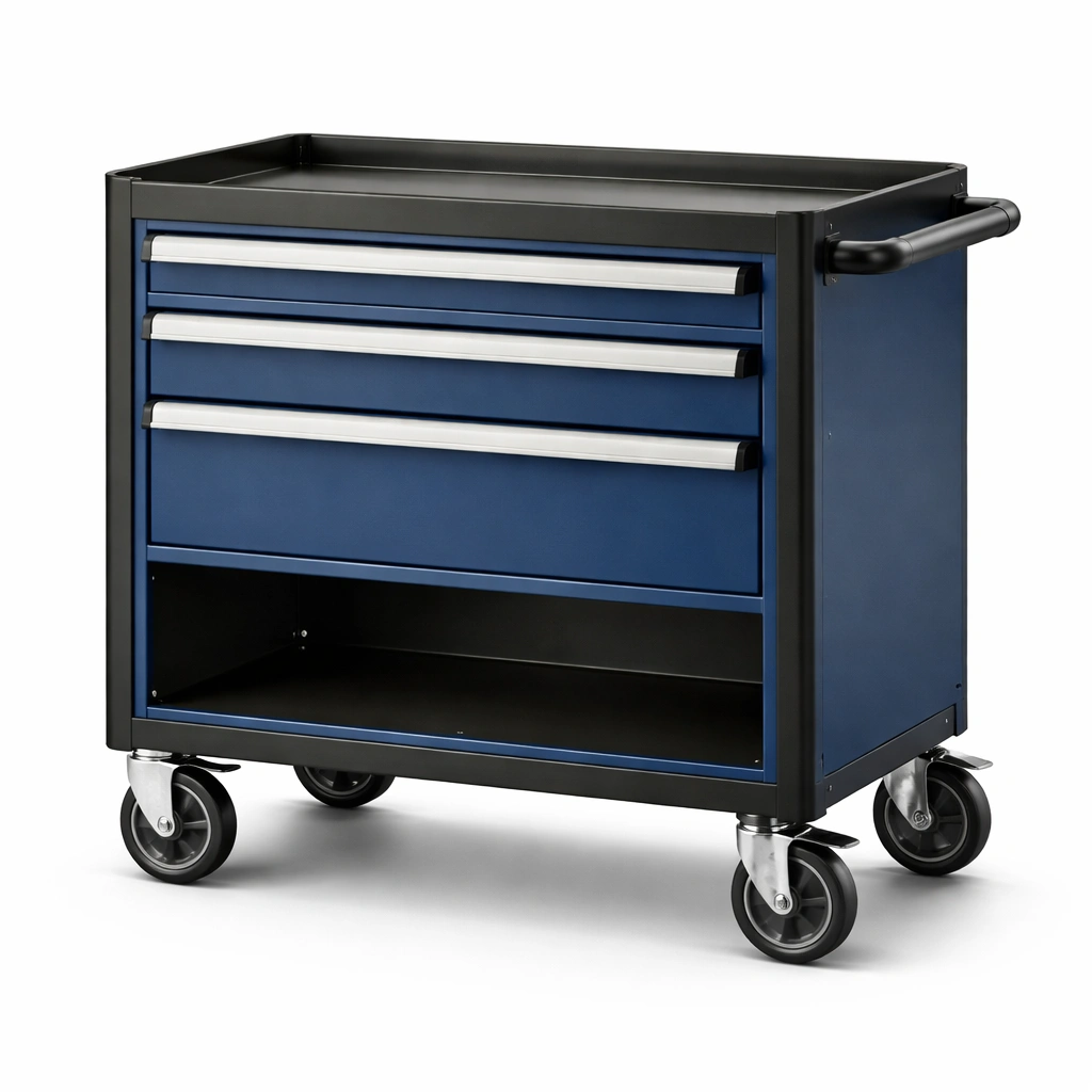 Este carro de herramientas proporciona almacenamiento organizado y movilidad. Equipado con 3 cajones de acero y ruedas giratorias con trabas. Fabricado en acero con un acabado en recubrimiento en polvo.
